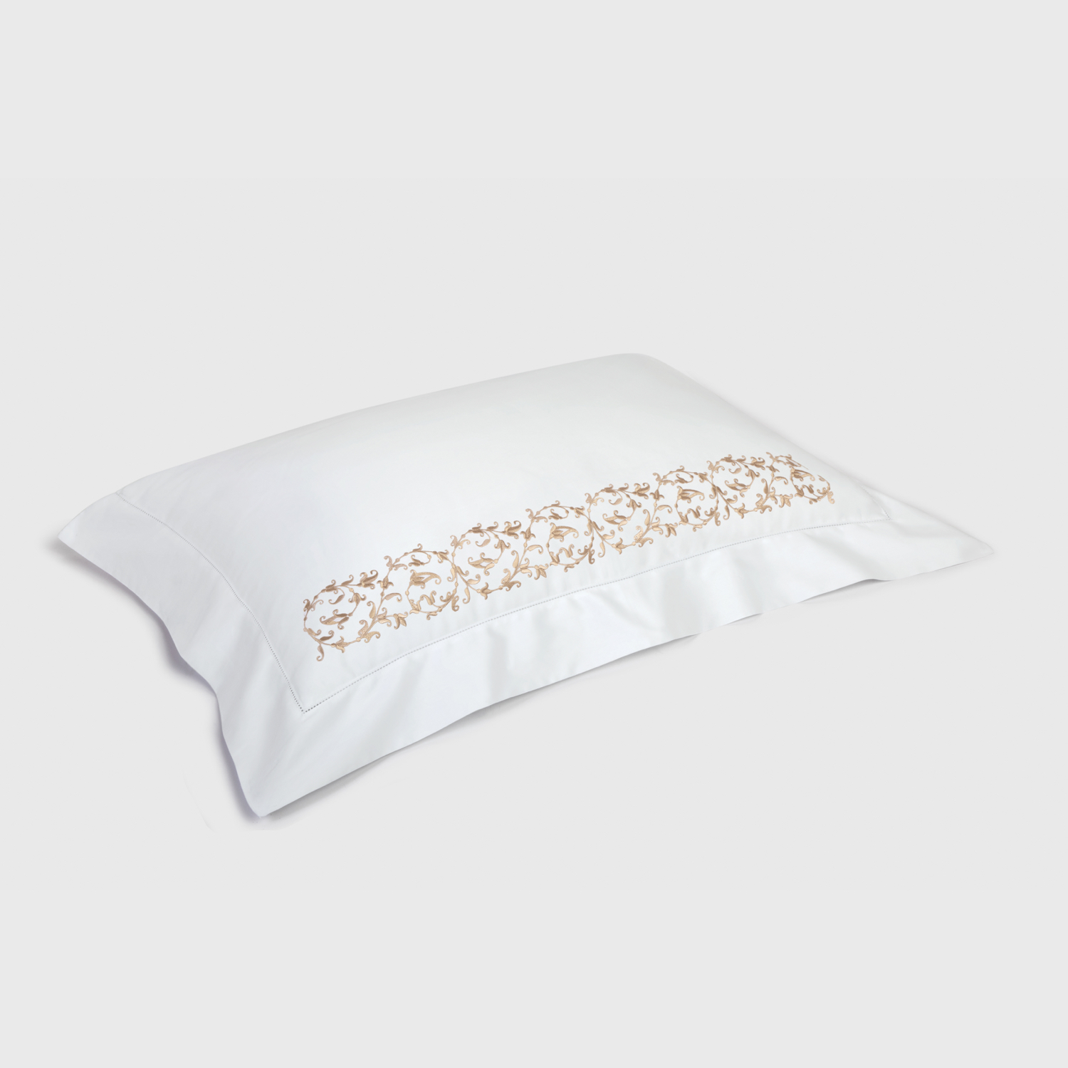 Curved lines and interlaced elements delicately embroidered on Italian long staple cotton sateen fabric. Featuring a classical arabesque design with a modern energy.