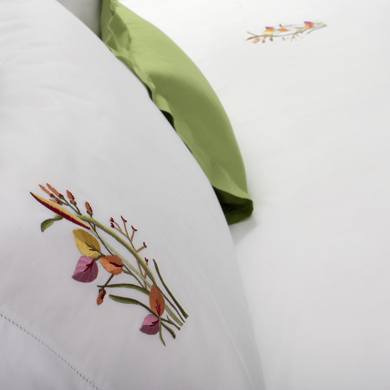 Hand embroidered by our skillful artisans, our floral bed sheets feature an explosion of colours, beautifully dressing your bed like a painting. Carefully crafted on long staple cotton satin, they add a unique touch to your bedroom.
